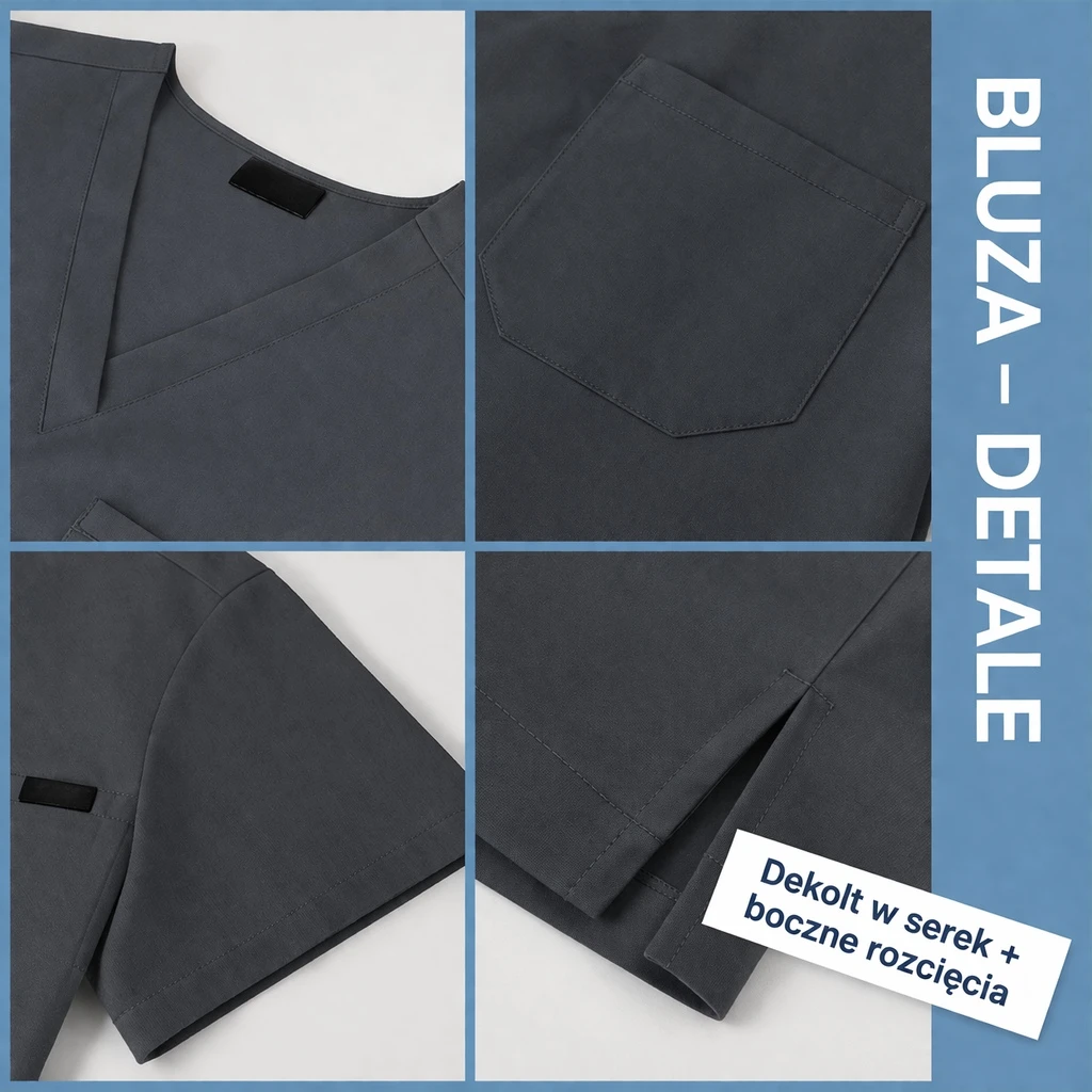 Bluza medyczna ma dekolt w literę V oraz trzy praktyczne kieszenie. Spodnie mają średni stan, regulację w pasie za pomocą troczka i zwężane nogawki zakończone ściągaczem. Dodatkowe kieszenie na nogawkach ułatwiają przechowywanie podręcznych przedmiotów.