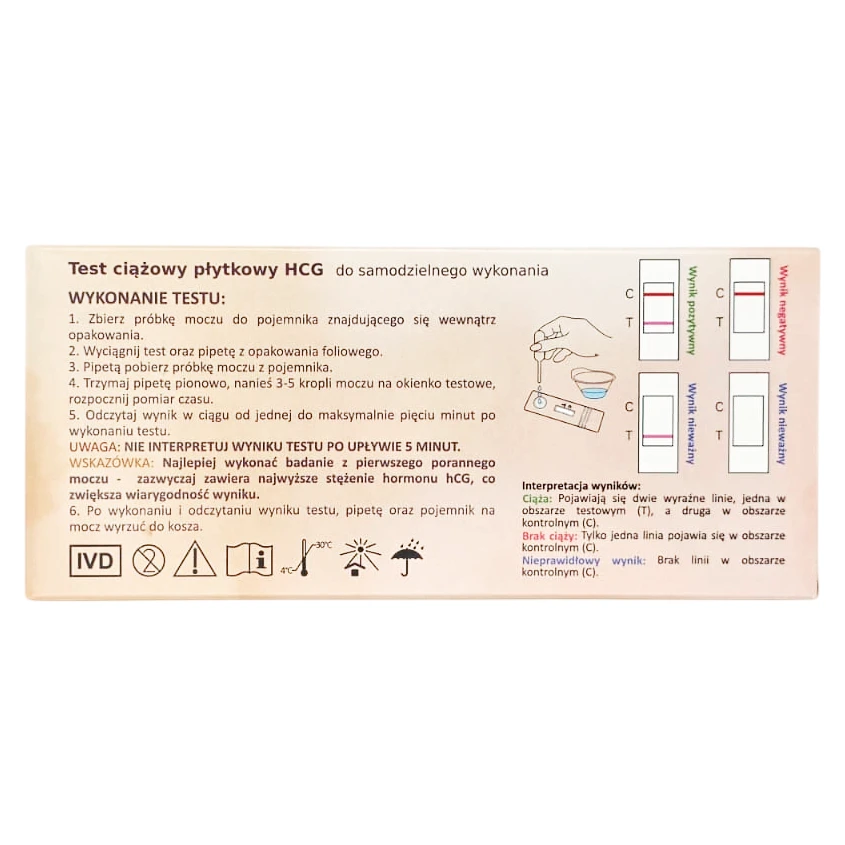 Dla większej wiarygodności badania najlepiej wykonać test z pierwszego porannego moczu, który zazwyczaj zawiera najwyższe stężenie hormonu hCG. Produkt jest przeznaczony do samokontroli i nie zastępuje konsultacji medycznej ani dalszej diagnostyki. W przypadku dodatniego, niejednoznacznego albo budzącego wątpliwości wyniku warto skonsultować się z lekarzem.